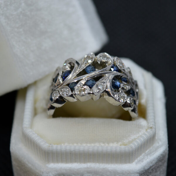 This ring is custom made in the boutique, rhodium plated and polished for maximum shine. Genuine AA round sapphires and round brilliant cut diamonds are set throughout the curls and swirls of this gorgeous filigree design. Every detail is uniquely crafted by hand. A perfect gift for someone born in September or who loves sapphires.